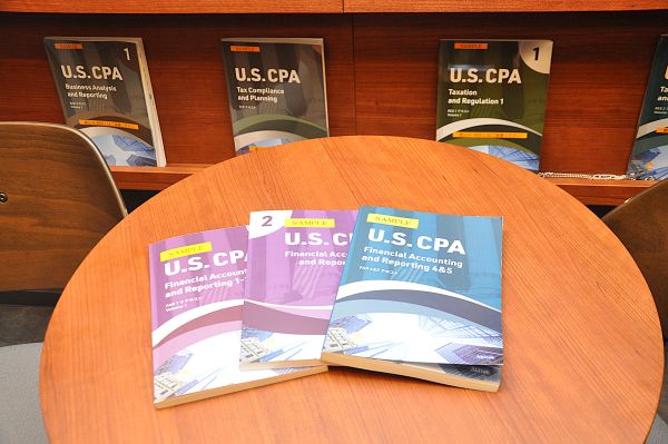 米国公認会計士(USCPA)受験用のテキスト=東京都渋谷区のアビタス本社、2026年4月1日