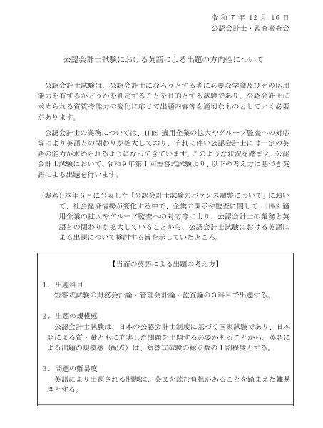 英語での出題を発表した金融庁公認会計士・監査審査会の文書