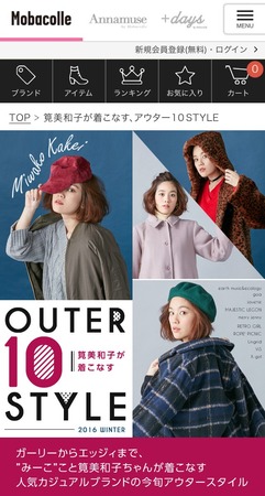 今回の新コンテンツは、モバコレ取り扱いのカジュアル主軸10ブランドのアイテムを、現在22歳の筧美和子さんを起用し『最新冬アウター10スタイル』としてコーディネートを紹介するものです。筧さんは年齢的にも顧客層と合致し、ライフスタイルからファッションに至るまで女性たちに支持されている点から、等身大のスタイルを披露してくれています。