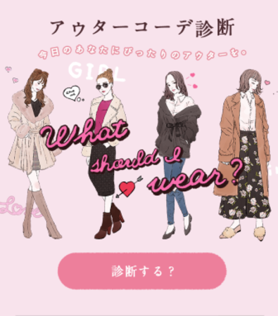 『アウターコーデ診断』とは、診断ゲーム形式で「あなたにぴったりのおすすめアウター」を提案する、ユーザー参加型ゲームです。お客さま自身が好きな洋服テイストを選択していき、診断結果で「SNSでシェアしたくなる」かわいいイラストのトータルコーディネートを見ることができます。