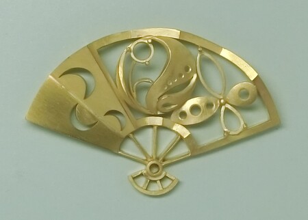 支給されたK18地金を使い、課題作品を11時間で製作。指定寸法に則り材料の切り出し、やすり掛け、ろう付、表面の仕上げを全て手作業で行います。今回は全体が扇のデザインで、川の流れをイメージしたすかし部分と、マーキースとペアシェイプの石座などで蝶をモチーフにしたパーツが左右に配置されています。