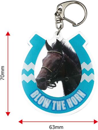 蹄鉄をイメージした勝負服柄の枠に競走馬の肖像を配置したアクリルキーホルダー。