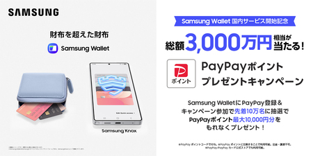 2025年3月1日(土)より、Samsung WalletにPayPayを登録しキャンペーンに参加すると、先着10万名様に抽選でPayPayポイント最大10,000円分をもれなくプレゼントするキャンペーンを実施いたします。