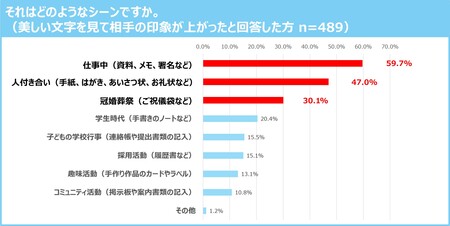 また、美しくない文字を見て相手への印象が下がったと回答した人は半数以上の53.5%。具体的なシーンとしては、こちらも印象が上がった時と同様に、「仕事中(資料、メモ、署名など)」、次いで、「人付き合い(手紙、はがき、あいさつ状、お礼状など)」「冠婚葬祭(ご祝儀袋など)」となり、特にビジネスの場面で文字の美しさが人の印象を左右する傾向がわかりました。