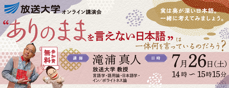 放送大学では、滝浦 真人(放送大学教授)を講師として、オンライン講演会「 “ありのままを言えない日本語”は一体何を言っているのだろう? 」を開催いたします。