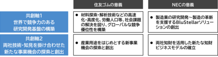 具体的には、住友ゴムが保有する高機能ゴムに関する技術をNECの事業分野に応用・適用することや、NECが保有するAI技術を住友ゴムが手掛ける新事業へ適用することを検討しています。さらに、「世界で競争力のある研究開発基盤の構築」において取り組む、マテリアルズ・インフォマティクス(注3)などの先端ICTを活用したDX推進により、知財の迅速な創出を目指していきます。