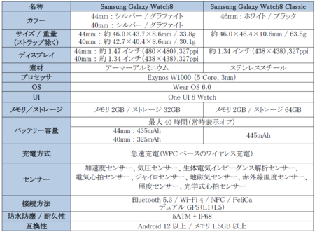<主な仕様 :「Samsung Galaxy Watch8│Watch8 Classic」>