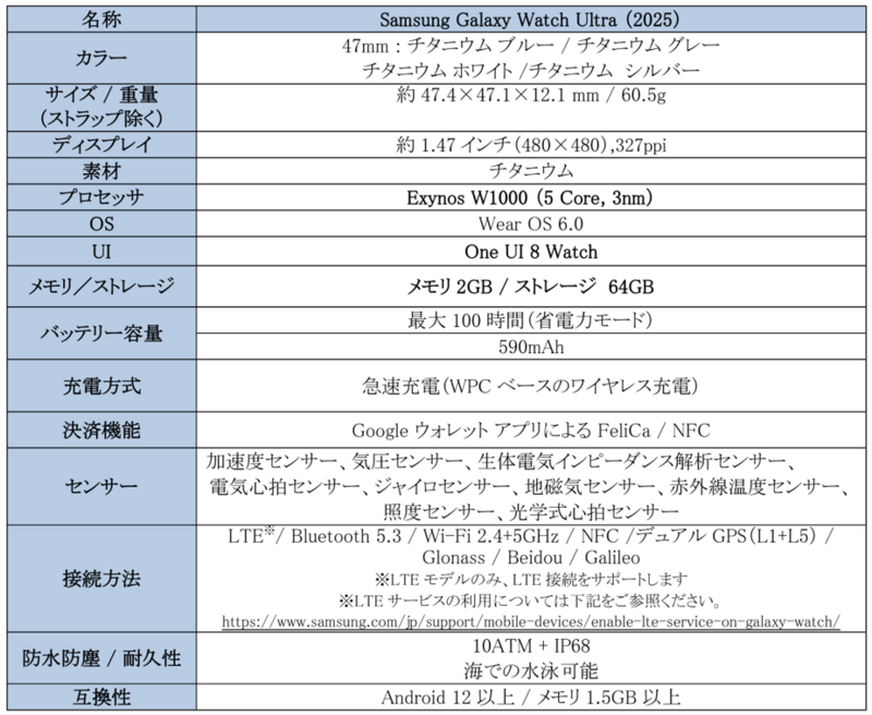 <主な仕様 : 「Samsung Galaxy Watch Ultra (2025)」>