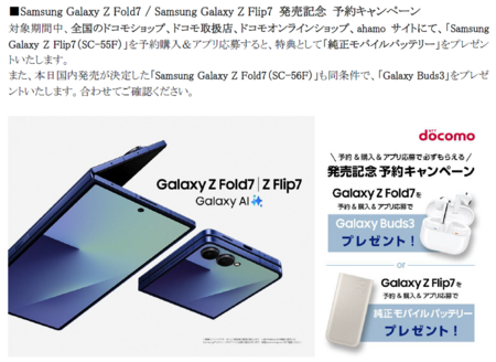 また、本日2025年7月17日(木)より全国のドコモショップ、ドコモ取扱店、ドコモオンラインショップ、 ahamoサイトにて「Samsung Galaxy Z Flip7発売記念 予約キャンペーン」※を開催いたします。