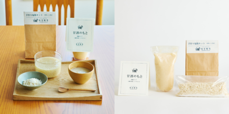 4日間かけて丁寧に仕込んだ伝統製法の生麹を使用した「塩麴キット」と、糀と米だけで仕立てた「甘酒のもと」が入った、ご家庭でも手軽に発酵食を楽しめるセット商品を本モール限定でご用意。風味豊かでまろやかな塩麴キットは、塩の代わりに肉や魚の漬け込みやドレッシングに使うことで、料理に奥深い旨味をプラスできます。甘酒のもとは、料理に使用することはもちろん、濃縮タイプのため牛乳や豆乳で割ってもお召し上がりいただけるほか、そのままヨーグルトソースとしてもお楽しみいただけます。