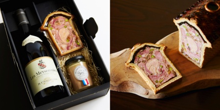 東京都田園調布にある食肉加工専門店「メッツゲライササキ」の「鴨とフォアグラのパテ・クルート」は、福田耕平シェフが2021年フランス・リヨンで開催された「パテ・クルート世界選手権決勝大会」で優勝したスペシャリテ。そのほか「鶏白レバーとフォアグラのパテ」と、2品と相性抜群のフランス・ローヌ地方のワイン「M.シャプティエ/クローズ・エルミタージュ ルージュ レ メゾニエ ビオ 2021」をセットでご用意しました。