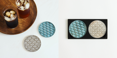 町工場が持つ高い技術力を活かし、四季や和柄を表現したコースターに新柄が登場。福岡県筑後地域の「八女茶」や、同県柳川市で挑戦的に取り組まれている希少な「珈琲栽培」をモチーフにした、夏らしい涼し気なデザインです。飲み物の水滴が下部に溜まる二層式の構造で、木製テーブルの上でも安心してご使用いただけます。アイスティーやアイスコーヒーなどとともに、夏のひとときを彩るアイテムです。