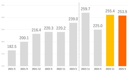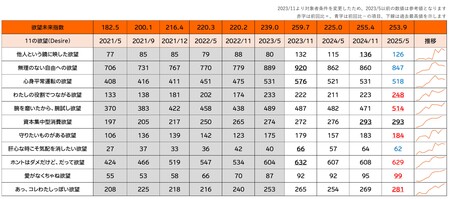 最新の「欲望未来指数」は253.9(前回255.4)と前回に引き続き高水準を維持しており、活発な消費意欲が継続していることがうかがえます。なお、2023年11月から15~19歳を調査対象に追加したため、2023年5月以前の結果は参考値となります。また、昨年3月に発表した「11の欲望」※4のリニューアルを踏まえ、過去の指数についても改めて算出しています。