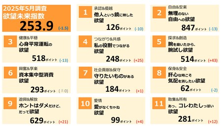 2024年11月調査における「欲望未来指数」と「11の欲望」()内は前回比増減