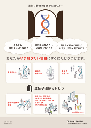 CSLベーリング株式会社(本社:東京都港区、代表取締役社長:吉田いづみ)は、患者さんおよびご家族の皆さまに向けて、遺伝子治療に関する正しい知識と理解を深めていただくことを目的とした情報サイト「遺伝子治療のトビラ」(URL: https://idenshi-chiryo.csl-info.com )を、2025年7月22日に公開いたしました。