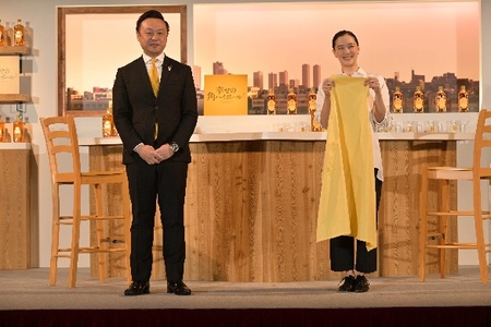 蒼井さんのサントリーウイスキー「角瓶」TV-CMの店主役就任と、新店舗開店をお祝いして、店主のアイコンとしておなじみの「黄色いエプロン」をサントリー株式会社 スピリッツ本部 ウイスキー部 部長 小田 明より贈呈しました。小田は「この度は約10年ぶりのCM刷新にあたり、4代目の店主役を担っていただきありがとうございます!それでは歴代の店主も着ていた「黄色いエプロン」を贈呈させていただきます!これからどうぞよろしくお願いします!」と伝え、歴代店主のアイコンともいえる「黄色いエプロン」が、新店主の蒼井さんに贈られました。「黄色いエプロン」をつけ、カウンターの中に入った蒼井さんは「こうしてエプロンをつけると、店主として身が引き締まります。このエプロンをつけて、カウンターに入ることは、角ハイを受け継がれてきた方々と一緒に歩んでいくことだと感じています。本当に大切に受け継がれてきた角ハイなので、私も大切にブランドの世界観をしっかり表現して、多くの方に角ハイボールの美味しさを伝えられるよう頑張ります」と新店主としての意気込みを語りました。