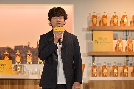 蒼井さんに黄色いエプロンを着用いただき、いよいよ開店の準備が整ったところで、ふらりと“寄り道”されたのは、サントリーウイスキー「角瓶」の新TV-CMに客役でご出演の染谷将太さんです。染谷さんは「皆さんこんにちは。サントリー「角瓶」の新CMに客役として出演しております染谷 将太です。よろしくお願いします」と挨拶をしました。