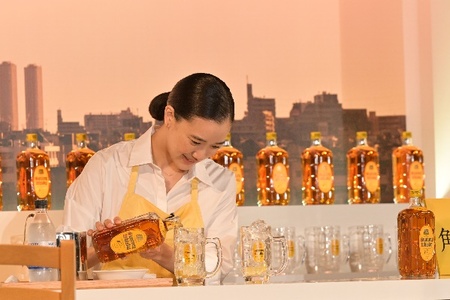 開店祝いに駆けつけてくれた染谷さんのために、店主の蒼井さんは「幸せの角ハイボール」づくりにチャレンジしました。蒼井さんは、今回、店主役となるために、実際にバーテンダーの先生に作り方を習ったとのこと。蒼井さんは「皆さん、角ハイの作り方には細かいこだわりがあるので、それをひとつひとつ丁寧に教えていただきました。私も作れるようになりまして、今では家でも美味しく作っています」と、コメントしました。そして、染谷さんより「蒼井さん、『幸せの角ハイボール』お願いします」とオーダーが入ると、蒼井さんは手慣れた手つきで作り始めます。途中で蒼井さんは「まずは、グラスにレモンを絞って、氷は山盛りに入れるのですが、氷をうまく入れるのが難しいんですよね…」などと、角ハイボールを作るポイントを説明しながら作っていると、会場はまるでお店にいるようなほっこりした雰囲気に包まれました。