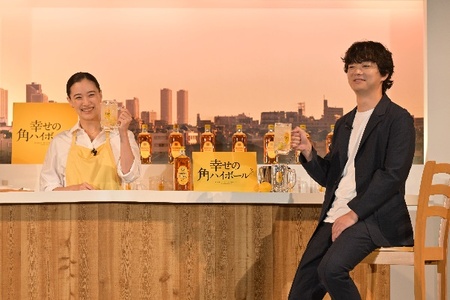 蒼井さん「幸せの角ハイボール」づくりにチャレンジ!染谷さん「蒼井さんの心のこもった一杯、とても美味しいです。まさに“幸せ時間”ですね」と感動!