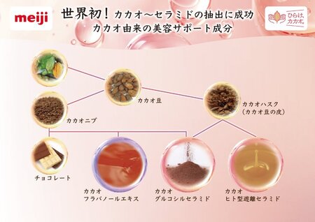 カカオニブやカカオハスクから抽出した「カカオセラミド」と特許出願中※5成分「カカオフラバノール」、これらのカカオ由来の美容サポート成分を活用しながら、従来のチョコレートとは異なる食品の開発を進めてまいります。(本商品にはカカオニブ(胚乳)由来のカカオグルコシルセラミドを使用しています。)