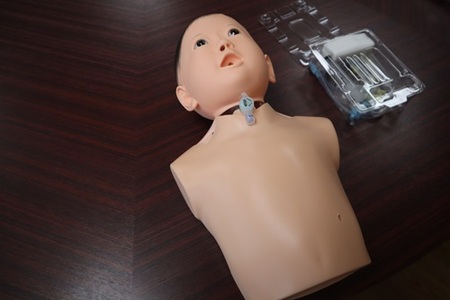 寄付金贈呈式の際、2025年4月にお届けした寄付金にてご購入いただいた医療的ケアを練習する人形を見せていただきました。 医療的ケアを必要とするお子さんは増加しており、特に、人工呼吸器を使用しながらご自宅や地域で生活しているお子さんの数は、過去10年でほぼ10倍に増えています。このため、ご家族や介護者のみならず、保育園、幼稚園、学校、診療所、地域活動に携わる方々にとっても医療的ケアの練習機会がますます必要となっています。今回ご購入いただいた人形は、実際のケアで使用する医療用具が体内のどの位置にどのように挿入されるかを視覚的にイメージしやすい設計となっています。