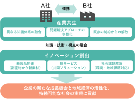 多くの企業がサーキュラーエコノミーへの移行を経営戦略に掲げる中、具体的なビジネス実装が進まない課題に直面しています。一方で、BtoB領域は大量の資源が流通し、企業間の長期的・安定的な取引関係が構築されていることから、循環型社会の実現において重要な鍵を握っています。本サービスは、このBtoB領域特有の構造を生かし、地理的に近接する異業種間での連携を通じて廃棄物や副産物などの資源を相互に有効活用する「産業共生 (Industrial Symbiosis)」※2に着目しました。「産業共生」は、環境負荷の低減とコスト削減の両立だけでなく、それぞれの企業が持つ知識や技術の融合を図ることで、地域のオープンイノベーション基盤にもなります。サーキュラーエコノミーへの移行を加速させる仕組みであると同時に、企業の成長機会と地域経済の活性化の実現に貢献する重要な取り組みです。