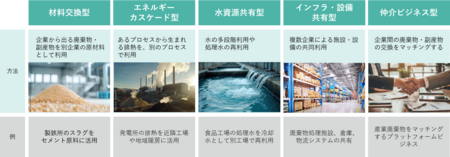 ※2 「産業共生」とは、地理的に近接する異なる産業間で、廃棄物や副産物、エネルギー、水などの資源を相互に交換・利用する取り組みです。CO2削減に多面的に貢献し、環境負荷を低減しながら経済的な利益を目指します。「産業共生」の取り組みには 5つの代表的なタイプがあります。