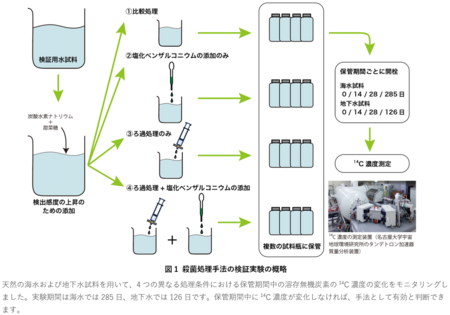 比較対象とした処理は、以下の4条件です(図1)。①ろ過を行わず塩化ベンザルコニウム添加もしない(比較処理)、②塩化ベンザルコニウムの添加のみを行う、③ろ過のみを行う、④ろ過をした後に、塩化ベンザルコニウムを添加する。なお、使用したろ過フィルターの孔径は0.22 µmです。①〜④の各処理を施した海水試料および地下水試料はそれぞれのバイアル瓶に取り分けて密閉し、保管しました。そして、保管期間の経過に応じて順次開栓・処理を行い、溶存無機炭素の14C濃度の変化を測定しました。保管期間は、海水試料では0日、14日、28日、285日、地下水試料では0日、14日、28日、126日です。