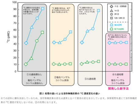 実験結果(図2)では、無処理の①において、顕著な14C濃度増加が確認され、実験に使った水試料には微生物が含まれており、保管期間中に微生物活動によって溶存無機炭素の変化が引き起こされたことがわかります。ろ過のみを行った③でも、①と比較して変化は小さいものの、14C濃度の変化がありました。塩化ベンザルコニウムの添加のみを行った②は、地下水試料では14C濃度の変化が見られなかったのに対し、保管期間28日目以降の海水試料では変化が検出されました。これは、塩化ベンザルコニウムに耐性をもつ「芽胞」という形態をとる微生物が生き延びて、塩化ベンザルコニウムの殺菌効果の低下にともなって栄養細胞に戻って増殖(有機物を代謝)した可能性を示しています。しかし、②の処理にろ過が加えられた④では、地下水・海水いずれにおいても、14C濃度の変化はほとんど検出されませんでした。ろ過処理によって芽胞や芽胞を作る種類の微生物が物理的に除去された後に塩化ベンザルコニウムを添加したことで、水試料中の微生物が効果的に殺菌され、14C濃度の変化が抑制されたと考えられます。なお、これまでの手法にはなかった、ろ過処理の導入にあたっては、ろ過処理が分析値に与える影響の検証が必要にはなりますが、今回の検証ではろ過処理の影響は無視できる範囲にあることを確認できました。