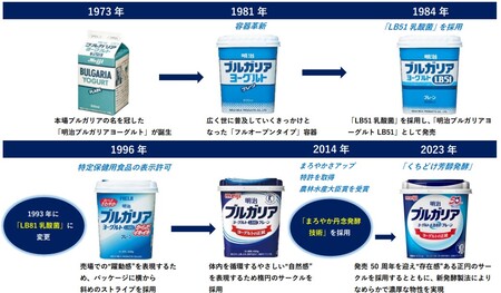 「明治ブルガリアヨーグルト」は1970年の大阪万博をきっかけに1973年に誕生し、2023年に発売50周年を迎えました。現在の「明治ブルガリアヨーグルト」は、本場ブルガリアのLB81乳酸菌と国産の良質な生乳を使用し、独自製法の「くちどけ芳醇発酵」を採用したくちどけの良い味わいのヨーグルトです。