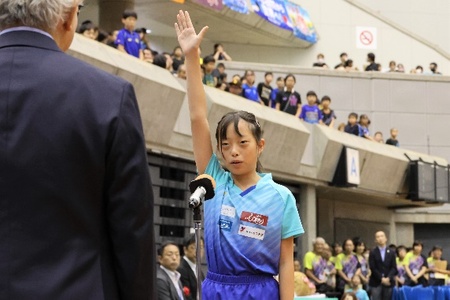 また、出場選手を代表して兵庫県の小学5年生、岡田結愛選手(OKATAKU)が選手宣誓を行い、「どんな試合でも相手をリスペクトして戦います」と大会への意気込みを述べました。