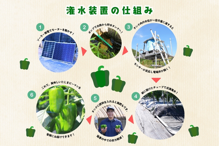 ピーマンの品質と収穫量を確保するためには十分なかん水(水やり)が必要不可欠です。しかし近年の猛暑により、栽培にはかつての倍以上の水が必要で、1本の苗に毎日5〜8リットルの水を与えなければならず生産者の負担は増す一方。作業負担軽減のためには水やりの自動化ができるかん水(かんすい)装置の導入が急務ですが、高額な初期費用のため導入できない生産者も多く、ピーマン栽培を続けたくても難しい現状があります。