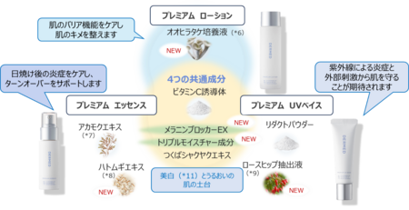 同シリーズは、「プレミアム ローション(化粧水)」、「プレミアム エッセンス(乳液状美容液)」、「プレミアム UVベイス(日焼け止め化粧下地)」の3商品からなる人気シリーズです。