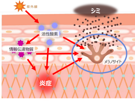 紫外線を浴びると、肌内部では、炎症の原因となる活性酸素や情報伝達物質が発生し、炎症を引き起こします。この活性酸素、情報伝達物質、炎症がメラノサイトを刺激することで、メラニンが生成され、シミとなります。