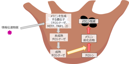 メラノサイトでは、細胞外の情報伝達物質などの刺激によって、まずメラニンの生成を促す遺伝子(チロシナーゼ、MITF、TRP1、TRP2)をつくるよう指示を受けます。