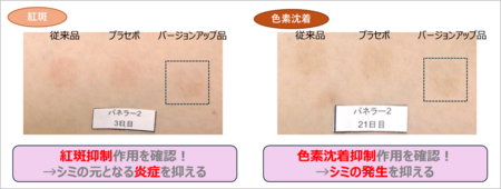 以下は実際に人の肌を撮影したものです。従来品や、美容成分が含まれていないプラセボよりも、バージョンアップ品の方が、紅斑、色素沈着ともに薄いことがわかります。(2024年の実験)