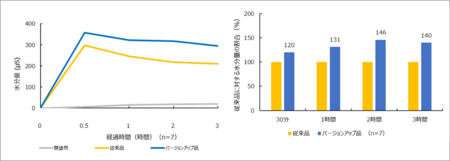 結果は、時間が経つほど差が大きくなり、バージョンアップ品の水分量の方が多くなりました。30分後は20%の差でしたが、2時間、3時間後は水分量が40%以上も高くなりました。時間が経っても肌の潤いが持続することがわかりました。(2024年の実験)