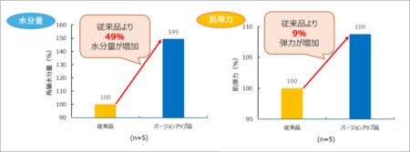 肌内部の水分量は、従来品に比べバージョンアップ品は約49%もアップしていました。肌弾力についても、バージョンアップ品が9%上昇しました。(2024年の実験)