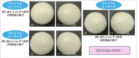 「プレミアム ローション」と「プレミアム エッセンス」のバージョンアップ品は、従来品に比べ、肌の潤いが続く。