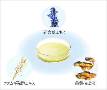まず、「オオムギ発酵エキス」には、最初の引き金となる情報伝達物質の刺激を阻害する働きがあります。そして「延命草エキス」には、メラニンの生成を促す遺伝子(チロシナーゼ、MITF、TRP1、TRP2)の発現を抑える働きがあることを、今回、突き止めました。加えて、「桑黄抽出液」には、未成熟のチロシナーゼを成熟させるのを阻害する働きがあることも確認しています。