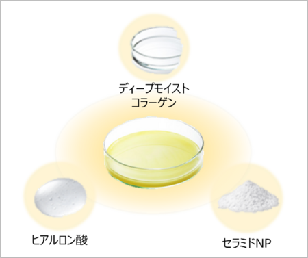 もう1つの新共通成分「トリプルモイスチャー」は、「ディープモイストコラーゲン」、「ヒアルロン酸」、「セラミドNP」からなる複合成分で、肌のうるおいを守ります。