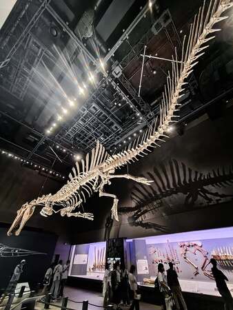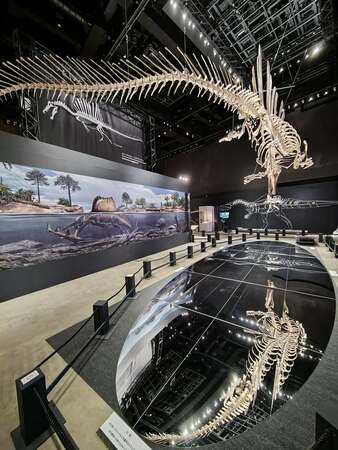 博物館泳ぐ14mスピノサウルス!最速5万人突破の恐竜展「獣脚類2025」。福井県立恐竜博物館で好評開催中!