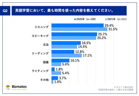「Q2.英語学習において、最も時間を使った内容を教えてください。」(n=109)の回答では、「リスニング」が最も多く29.4%を占めました。リスニングの学習時間が最も多い背景には、AI英会話や音声教材など、音声を中心とした学習ツールの進化・普及があると考えられます。また、「スピーキング」(25.7%)も依然として上位にあり、多くの学習者が「聞く」「話す」といった実践的なインプット・アウトプットスキルの向上に重点を置いていることがうかがえます。