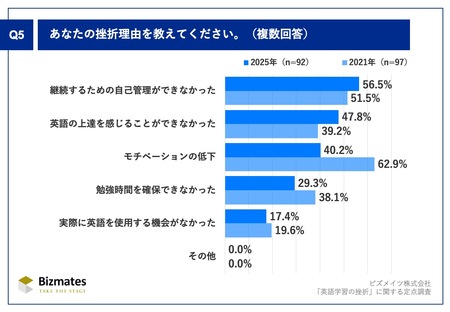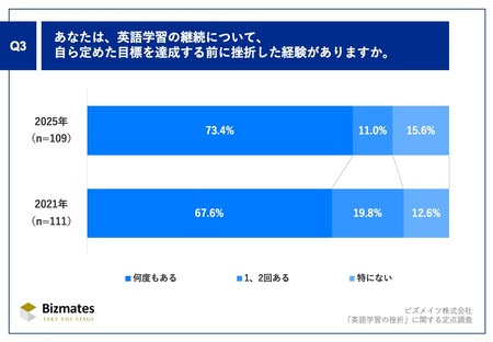 ビジネス特化型オンライン英会話サービス「Bizmates(ビズメイツ)」を提供するビズメイツ株式会社(本社:東京都千代田区、代表取締役社長:鈴木 伸明 、以下「当社」と言う。)は、社会人になってから英語を学習した経験がある会社員109名を対象に 「英語学習の挫折」に関する定点調査(2021年実施の同調査と比較 ※1)を実施しました。