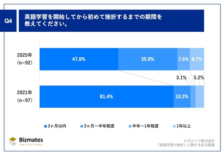 また、特にビジネスパーソンの間では、英語力がキャリア形成や国際業務の必須スキルとして認識され、短期的な成果よりも、中長期的な視点で計画的に取り組む姿勢が浸透し始めていることも、学習継続期間の延長に寄与している可能性があります。