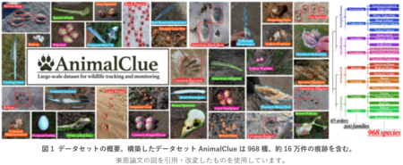 本研究では、アニマルトラッキングを画像認識技術によって自動化する手法を考案し、専門的な知識を必要としない汎用的なモデルの開発に成功しました。まず、65属、200科、968種にわたる総計約16万件の痕跡情報に、動物の行動パターンや生息地域に関するアノテーション、生物階層情報などを付与して、大規模データセット「AnimalClue」を構築しました(図1)。