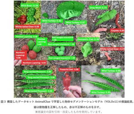 次に、このデータセットを用いて、画像認識AIモデルを学習させ、画像識別、物体検出、物体セグメンテーションの各AIモデルを構築しました。画像識別においては、たとえば羽の画像においてはTop-1精度(最も確からしいとモデルが判断した1位の予測が正解である割合)65%以上で、555種の候補の中から正しく種を識別できることを確認しました。図2および図3は、それぞれ物体検出モデルと物体セグメンテーションモデルの推論結果を示しています。物体検出モデル(図2)は、画像内の各物体を矩形(バウンディングボックス)で囲むことで位置とクラスを予測します。一方、物体セグメンテーションモデル(図3)は、物体の形状に沿って各ピクセル単位で領域を分類し、より詳細な輪郭情報を得ることができます。細かい種の分類についても、一般の方が見て判断が難しい痕跡を正しく識別できることを確認しました。このように、高度な専門的知識が求められるアニマルトラッキングの分野において、AIによる代替が期待できます。まだ改善の余地はあるものの、我々は学習データの公開およびベンチマーク評価も実施しており、今後、さまざまな研究者がこの分野に取り組むことを期待しています。