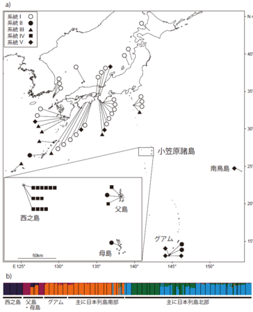 西之島には父島と同じ系統が分布している(a)。また、西之島の個体群は独自の遺伝的組成を持っている(b)。