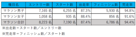 北海道から沖縄県まで47都道府県をはじめ、海外ランナー16名を含め、8,000名を超えるエントリーがあり、完走率は94.4%でした。