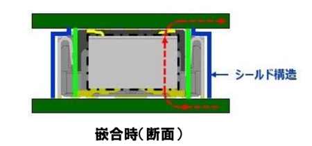 プラグ側とリセプタクル側、それぞれの外周を導電性の金属で覆ったフルシールド構造※1を採用しました(図1参照)。フルシールド構造※1は、コネクタの本体や接続部分が金属シェルによって外周を覆われているので、ノイズの侵入や漏洩を最大限抑制することができ、EMI特性※2を向上することが可能となります。本製品は嵌合時、二重シールド構造になり、電気信号の回路がシールドの内側を通ることで、ノイズの発生を抑制します(図2参照)。